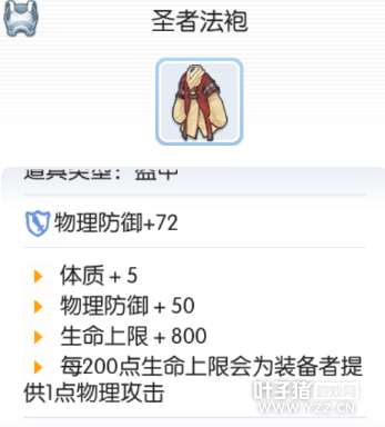 升级前:圣职之衣 体质+2 物理防御+20 生命上限+200 升级过程 I 白色染料*3,万能药*80,雪勒结晶*285, II 天地树叶子*50,死人遗骨*80,刹勒空结晶*283,雷蒙盖顿的短毛*20 III 断柄之刃*20,铠甲碎片*70,光粒*2,神之手*489 END 断柄之刃*35,铠甲碎片*70,缎带*3,泯灭之心*588 升级之后:圣者法袍 Vit+5 物理防御+50 生命上限+800 每200点生命上限会为装备者提供1点物理攻击(限定3转商人系/神官可装备) 抗魔靴→高级凉鞋