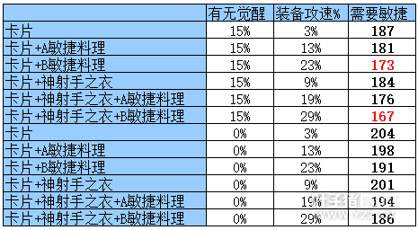 其实需求敏捷是包括了敏捷料理提供的敏捷在内的. 目前为止可以得到的结论: 一般情况下,不依靠附魔的猎人,能获得的敏捷加成是60多点,能够做到的满速组合(红色标出)基本上都要考虑B料理和觉醒药水. 而"卡片+B敏捷料理+觉醒药水"是个非常微妙的组合,在全身没有额外敏捷攻速附魔的情况下,猎人可以获得的敏捷是,属性点99,job加成23,狙击buff5,心神凝聚10,天赐20,敏捷料理10,不带熊2,初心者卡片1,九尾卡片2,虎蜥人卡片解锁1,这些加起来是173.而173点敏捷刚好可以达到480%攻速. 不同于刺客,猎人的敏捷job加成较低,职业攻速也低,尽管有自身被动和buff,但依然很难像刺客一样轻易满速. 因为不容易满攻速,所以大多数情况攻速消耗品有提升,所以猎人对于消耗品的依赖程度更大,无愧美食家的称号.这点对于暴击同理. 更多仙境传说RO手游守护永恒的爱的攻略、资讯、礼包等内容,敬请关注 叶子猪仙境传说RO手游专区 。