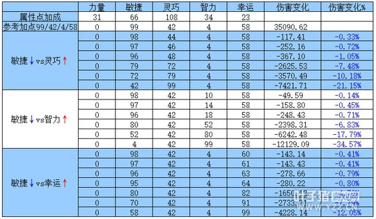 如图所示,在当前配装99/42/4/58这个加点的基础上,只要降低敏捷最终都会降低dps,且减的越多降的越多.那么对于ail(如果有这种流派)来说,放弃敏捷损失海量平射伤害,放弃智力损失海量主动鸟伤害十分尴尬. 单凭某一个配装某一个加点,还无法决定属性点优劣.但其实,99/42/4/58这个加点,本来就是计算出来的最优加点,除此之外我还模拟过很多很多种情况. 结论:关于敏捷,最好的加点方式就是要么达到攻速上限,要么能加多高加多高. 当然也不是没有例外,有时候刚好降低1敏捷可以凑幸运的3倍数,可能会出现98敏捷的最优伤害方案.有的时候暴击的收益很高,且牺牲少量的敏捷能让幸运有额外的加成(神射).但大多数最优加点方案敏捷都是99,98,极少数会出现不到98的情况. 值得一提的是,即使是神射手之衣+神秘弓这种对灵巧和幸运有特殊加成的装备组合,在我的人物模型下,最终最优加点99/17/0/73,牺牲了3%物攻和5%暴伤,来保证攻速最大化.所以做了神射衣无脑怼幸运的可能会得不偿失. 更多仙境传说RO手游守护永恒的爱的攻略、资讯、礼包等内容,敬请关注叶子猪仙境传说RO手游专区。 欢迎加入玩家群:84245858 [编辑:叶子猪小秘书]