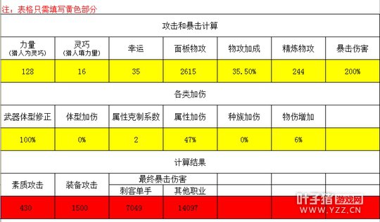 agi99优先加满我想大家都没意见吧,也许在大量buff下攻速会溢出,但是增加闪避还是不错的。 luk42主要考虑自身的18点幸运正好凑整数60,不仅是3的倍数又是5的倍数一点也不浪费,加伤我自身装备暴击已经达到了98点,插上小星巴卡以后可以达到108点,除去大部分怪物的防爆值基本能达到满暴95%,直接连暴击光环都不用开,节约了施法时间和sp。 vti39增加了接近2000血量以及部分防御值,可以让本来血就不多的刺客肉很多。 int19加伤自身5点智力正好24点,凑够6的倍数,加上装备回蓝达到了16,可以保证无耗使用满级致命涂毒挂机(满级致命涂毒永动需要14点sp回复速度)。 str本来是不想加的,因为str收益太低,其他属性点已经基本满足需求了,剩余属性点不知道加什么就全部加了力量正好29点。 str收益低主要是因为素质攻击不受属性加伤、体型增伤和属性克制的影响,至于str收益到底有多低下面进行一组测算: 根据RO的暴击伤害计算公式,最终暴击伤害 = ((装备攻击*(1+物攻加成)*武器体型修正*体型伤害*属性伤害+素质攻击)*种族伤害+精炼物攻)*(1+暴击伤害)*(1+伤害提升) 于是我做了一个暴击伤害计算表: