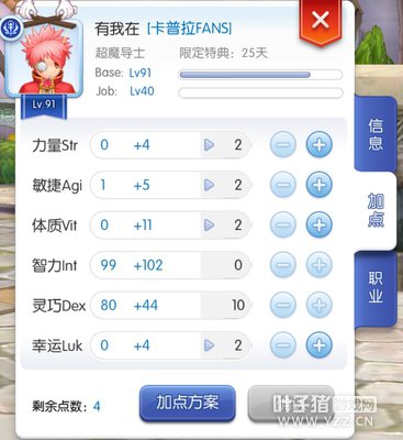 大巫师之杖在此次EP2.0中得到了大幅度提升,在升级到END后达到魔攻155,智力10,魔法攻击15%的强大属性,让其在日常实用性中大幅度提升伤害,其精炼所提升的忽视魔法防御对高法防魔物以及BOSS造成更高的伤害。并且在+10之后与永恒戒指激活属性可变吟唱时间-10%。 加点 目前版本陨石的强势有目共睹,一切以陨石为发展方向,ID加点无可争议,INT99后全DEX,如有多余点数推荐AGI,平A可激活将军魔杯卡效果。 以91级为例如下: