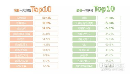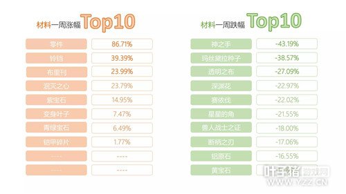 冒险者们: 随着冒险手册2.0公布并在测试服「预言之地」实装,一些可以存入后可以直接获得属性加成的廉价白卡开始走高,即使在测试服的数据只是带来3点物理攻击、30点生命或2点闪避,也难逃商人们的哄抢。同时由于财力转移,针对特定属性才生效的卡片(红蝙蝠卡、彩蝶精灵甚至海葵卡)则有小幅跌落。 「愚人节特辑:哥布灵王国の庆典活动」预告后,喷射背包的材料零件、绿宝石,兑换图纸需要的紫宝石开始紧俏。哥布灵家族的成员的面具图纸和成品也纷纷上榜。尝鲜族已迫不及待的在活动上线第一时间合成新时装的准备。 而红龙出品的石制圆盾开始达到卖家们的心里预期,今天开始井喷示的出现在交易所,预计持续走高。 一周总榜 20170320-20170327