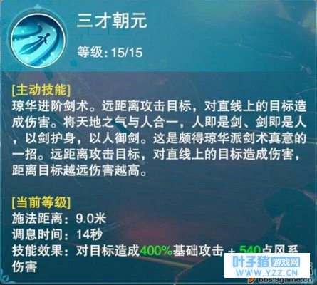 琼华是三大门派(不包括雷系的天罡)中持续输出伤害最高的门派,本篇将详细介绍一下琼华的技能。 被动 :每级提升少量自身攻击属性,最高10级。 分析 :攻击属性是琼华作为一个输出门派最重要的属性,对PVP和PVE的提升都非常大,PVE推荐能加 就加,PVP推荐前期不加,中期加满。 普攻 :对一条直线造成伤害,连续的第四次普攻将造成150%的伤害,且宽度提高200%。 技能一:三才朝元 分析 :攻击宽度大概为普攻的三倍,且难以躲避。但是加满后伤害提升不大,且没有附加特殊状态,所以推荐前中期不加。