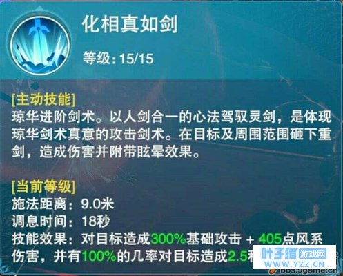 技能二:化相真如剑 分析 :琼华的唯一一个控制技能,施法极快,不容易被躲避。1级时控制概率为50%,眩晕时间较短。满级后100%几率2.5秒眩晕非常实用,配合大招可以打满整个大招伤害。PVP推荐先点满此技能,PVE可以不加。