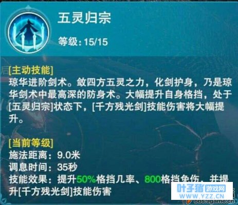 技能三:五灵归宗 分析 :满级后格挡几率和免伤较为乐观,此技能最大的亮点在于提升大招伤害。所以诸位在使用大招之前记得开启此技能。但是此技能的等级提升,对提升大招伤害效果不大。只要处于五灵归宗状态下,无论是1级五灵归宗还是满级五灵归宗,大招伤害均可以获得有效提高。所以PVP与PVE均不推荐先加。