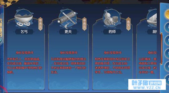 2、身份玩法 各位少侠想要扮演相应的身份,首先就需要发现身份。不同的身份发现的条件也是不同的。如乞丐身份发现的条件,就是各位少侠在完成主线任务“巢湖水岸”之后,去寿阳城中寻找他们的身影。而像更夫身份则是需要各位少侠首先完成主线任务“明珠有泪”,随后再去寿阳城体验他们的生活。其他的身份发现同样都有各自的条件。