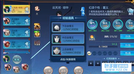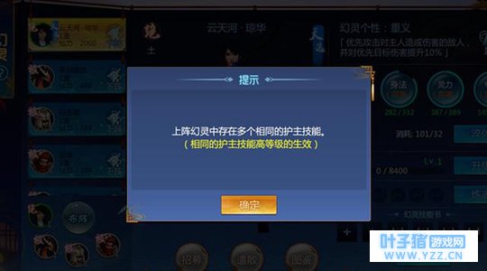 2、幻灵上阵 幻灵上阵的时候,各位少侠也有需要注意的地方。比如每个幻灵他都拥有着各自的护主技能。少侠在幻灵上阵的时候一定要选择护主技能不同的幻灵。只有这样,每一个幻灵的护主技能才会生效,否则拥有相同护主技能的两个幻灵同时上阵,只有护主技能高等级的才会生效。如极品幻灵“诰命”和绝品幻灵“云天河·琼华”。他们同时上阵的时候,只有一个护主技能“山神归”可以发挥作用。
