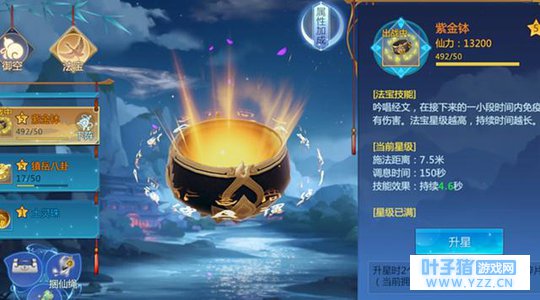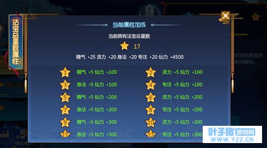 除此之外,每个法宝都拥有各自的星级。各位少侠拥有的法宝总星数达到一定的要求还能够获得额外的属性提升。如法宝总星数达到1星的时候,蓬莱门派少侠自身的精气就会+5且仙力+100,而当法宝总星数达到17星的时候,蓬莱门派少侠自身的精气就会+25,灵力+20、身法+20、专注+20,同时仙力+4500。星级越高,对少侠自身的属性加成也是越高的。