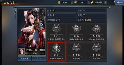 战马系统在提升主公战斗属性方面有着很大的帮助,当玩家通关章节“东吴之虎”后自动开启该功能,玩家可以根据武将的属性配备相应的战马,通过强化战马提升星级,使自己的坐骑拥有更佳的品质。橙品的战马还有附加技能,对战斗力有着更大的提升。玩家可以在日常的游戏中收集并镶嵌马魂。搜集橙品战马,觉醒后战马品质变成红色,并且获得额外属性,战马的孔变为龙魂孔,装备在龙魂孔上的马魂会增加恒定的额外属性。