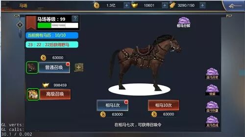 马场系统与战马系统同步上线,玩家在马场系统中可以通过相马来获得战马。马场的等级受主公等级所控制,在等级提高之后,玩家可以在其中获得额外收益。玩家每天都可以在马场中使用普通召唤与高级召唤来获得不同等级的战马,此外还可以通过相马来收集。