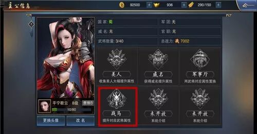 战马对于武将的作用之大已不必说,赤兔、的卢更是千古流名的千里马代表。 当玩家通关指定章节后便可自动开启“战马”功能。 玩家在马场系统中可以通过相马来获得战马。 将战马装备到拥有的武将上,可给武将带来额外属性和技能。 在获得重复的战马后,可以分解得到马魂,进而提升战马等级。