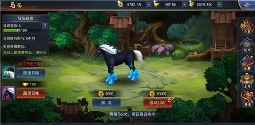 战马召唤又分为普通召唤与高级召唤,前者需要花费铜币,后者则需要消耗召唤令或者是元宝。玩家开始战马召唤后每次都能积累马场自身的经验,随着马场自身等级的提高,能够提升玩家免费相马的效率。