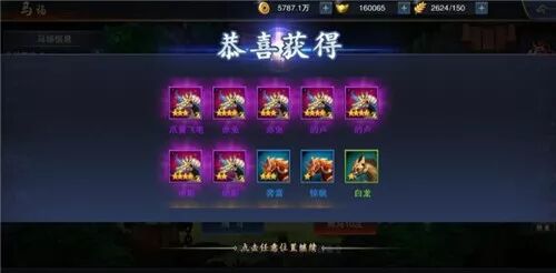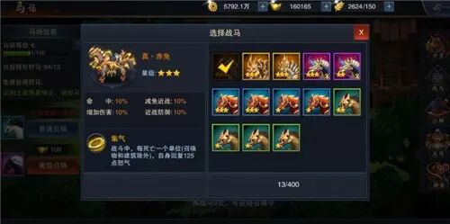 战马之间存在着品质高低的区别,根据属性由低到高可以分为:绿、蓝、紫、橙、红五种品质,在取得低品质的战马之后,可以通过升星来提升战马的战斗力。除此之外,还可以通过在马魂孔上镶嵌马魂石来给予战马额外的增益,每匹战马最多有5个马魂孔,全部装备完毕后就会成为一匹实力超群的良驹。在培养完毕后,就可以让武将骑乘,大大提升战斗力。