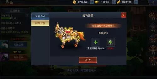 在获得重复的战马后,可以进行战马分解得到马魂,但是只有红色品质以下的战马才可进行分解。在游戏过程中会有马魂碎片,集齐后能兑换马魂。系统也准备了橙马合成服务,可通过橙马碎片随机合成一个任意星级的橙色战马。若是玩家拥有大量同星级战马的话可以选择合成更高星级的战马。