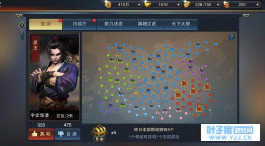 【宏大地图,划清势力范围】 在《血染征袍》的大地图机制下,共有十三股势力,除了魏蜀吴三个玩家势力之外,还有十个NPC势力,浩大的规模下共有超过150座城池鳞次栉比的伫立在地图上,完美的还原了那个群雄并起的三国时代。每个玩家的初始势力范围都是20座城池,想要获得更为广大的发展空间,就避免不了征战四方。