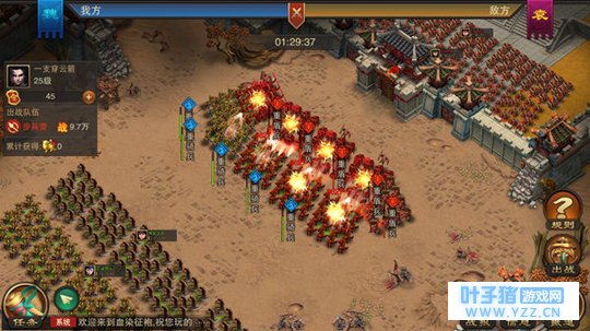 在玩家达到可以参与国战的等级之后,便可以接受主公的召唤,前往攻打别人的城池,在作战过程中,充满了玩家之间智慧的博弈,无论是攻城还是守城,无论是刺探军情还是围魏救赵,各类丰富的战略都蕴藏着玩家智慧的结晶。国战开启时,两军对阵,万箭齐发,随后是猛将冲锋陷阵,互相捉对厮杀,只为了最后的胜利。