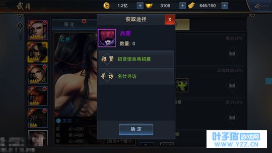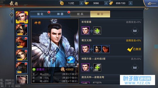 此外,缘分的加成在武将的带兵方面有极为重要的提升,且缘分武将不用一同上场也可以同时获得增益。除了给大家推荐刘关张三兄弟之外,关羽和吕蒙也是一对不错的选择,此外蛮王孟获和他老婆祝融,夫妻同心,也能增强战斗力。当玩家未能激活某对缘分组合时,系统也会给予大家武将的获取途径提示,方便大家寻访名仕,招募良将精兵!
