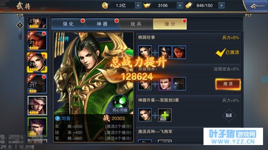 在缘分系统之中,点开武将的信息后可以看到缘分一栏,只要同时拥有缘分指定的多个武将后,即可激活缘分效果,获得增益属性。想要获得武将,最好的途径当然还是去招贤馆中进行招募了,虽然招募的结果是随机的,但是一旦招募出想要的武将,就能激活当前出战阵容中武将的缘分系统,进而提升战斗能力。 巧组武将搭配 发挥兵种优势 既然是缘分系统,首选搭配自然是大家津津乐道的刘关张三兄弟,获得这三人的武将卡牌后便可直接获得缘分加成“兵力+5%”。关羽与张飞两名武将作为先锋,输出能力剽悍无匹,而刘备而是坚强的后援。