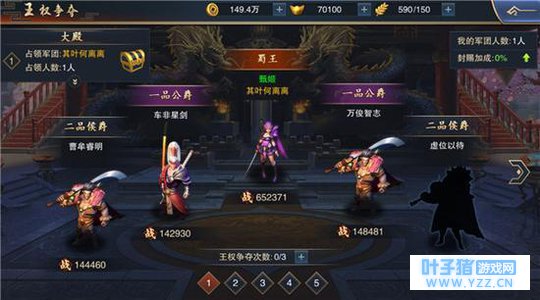 看到这里熟悉《血染征袍》的小伙伴就要问了,王权争夺玩法主要是爵位的斗争,与军团又有什么关系呢? 王权争夺玩法确实是击败爵位上的当前占领者后,则占领该爵位并享受该爵位的封赐奖励与特权。不过重点在这里!至关重要的军团来啦!官衙内同军团成员数量增加时,封赐奖励增加。每天22:00时进行王权结算,该时间官衙内占领人数排名第一的军团占领该官衙,全军团成员获得官衙奖励,还可占领多个官衙呢! 【国战优化】 游戏的核心“国战模式”必须是《血染征袍》的重点维护项目,更新后的国战玩法更加有趣味! 在“一骑讨”模式下,又针对兵种互克玩法给出了明显提示,决定派遣那支部队一目了然。