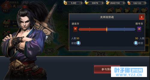 两军对垒,争夺城池 更新之后的国战系统,将更加注重一城一地的得失。在国战开始之后,所有城池和据点的占领值初始都是双方各占50%,双方站在同一起跑线上展开争夺,所以每分每秒都很重要。在城池与据点的交战中,每取得一些优势,获胜方的占领值就会得到相应的提高,如果占领值达到100%的话,城池便会归属给完全占领的一方。