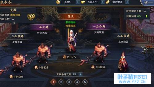 精英角逐 全服争霸 三国乱世,要想称霸全国一统中原,首先要做的就是先在本国称王。主公们在通关剧情第9-3章“兵贵神速”后方可开启的“王权争夺”玩法,便是决定一国霸主归属的关键所在。顾名思义,王权争夺所针对的,当属最令人垂涎的国家权力。在每天国王结算时间占领魏蜀吴国王爵位的玩家便可成为本国国王!国王拥有国战宣战特权,持续到下次国王结算。