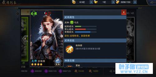 步练师作为一员四星名将,是弓兵定位,在各属性的成长上都是名将中的佼佼者,专属技能连珠箭能够在2秒内对敌方单体射出5箭,是一个高爆发的单体伤害技能,在神器觉醒之后,连珠箭的伤害将进一步的提升。步练师在游戏定位上,是后排射手,与黄忠有很大的相似度。