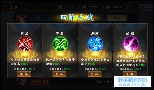 在我们进入到《血染征袍》武将界面之后,我们会发现新增的一栏——天赋,这就是我们新的变强之路。目前玩家能够解锁的天赋一共为4阶,需要我们对天赋升级,达到满足的标准之后就可以对天赋进行进阶啦。升级天赋需要消耗一定的天赋点,不过在升级之前,最好还是要仔细对天赋研究一下才行,避免造成资源的浪费。除了进阶以外,玩家还可以对天赋进行重置,不过需要消耗一定的元宝,所以进阶需谨慎哟!