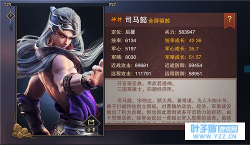 谈起三国中的武将,吕布是当之无愧的No.1,在《血染征袍》的游戏中,吕布的实力仍然深不可测,即使是和其他神将相比,吕布也名列前茅。在基础属性上,吕布是全方位无短板的全能型武将,必杀技天下无双更是超大范围的AOE技能,能够对周围所有敌方打击3次,造成巨额近战伤害,并且还会提升自己的移速与持续伤害。如此全面,实在是令人胆寒。 鹰视狼顾——司马懿