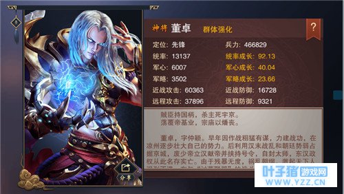作为诸葛亮后期最大的对手,司马懿在《血染征袍》中也有着神将的定位。相比于《血染征袍》的其他武将,单从伤害上来看,司马懿并不是特别突出的,但是他的必杀尤为恐怖,混元阵发动的时候,能够对全屏目标造成152%的远程伤害,瞬间爆发极高,最重要的,他还能驱散敌方增益和移除召唤单位,也就是说,司马懿几乎克制游戏中所有的武将。 嗜血凶徒——董卓
