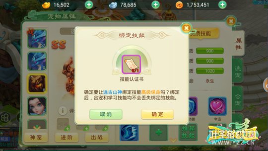 绑定技能保护主技能 主打“轻松”、“良心”的《西游女儿国》在宠物养成方面也为玩家提供了减负福利,合成宠物和给宠物打书的时候可以绑定任意技能,这样主技能就不会丢失,玩家也不会因为一次合成失误而浪费元宝。 传统的回合制手游中,5-6技能的宠物已经比较珍稀,《西游女儿国》的宠物合成和打书成功几率则更加亲民,玩家可轻松合成8技极品宠物(游戏中宠物技能合成上限为10个),让每个玩家都能享受到打造自己强力宠物的乐趣。