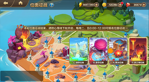 二、位面征战 位面征战是以公会为单位的全网对战,这里你可能碰到世界各地的玩家,通过占领资源点来获取资源。玩法在位面地图上展开,位面地图由出生点、资源点、路线组成,资源点和出生点存在和己方连线方且有防守队伍可产出资源,孤立的资源点不会产生资源。让我们来一场世界性的资源争夺战吧!