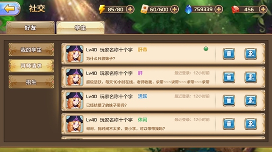 【师徒系统】 睥睨天下,也需良师传道授业;风雨兼程,更要明灯倾心相引。《星之召唤士》拥有开放性的师徒招募系统,以老带新,帮助玩家找寻到心仪的师父或者徒弟,快速上手游戏。 基于师徒系统,游戏还同步打造了丰富的师徒玩法,如拜师礼、师徒组队奖励、出师礼等。每个学生最多一个导师,每个导师最多3个学生,想找学生的玩家只要在等级达到60级且通关毁灭巨龙难度12后,即可发布招生信息,被系统推荐给没有导师的玩家。而等级较低的玩家想要得到帮助,只要点击“寻找导师”,就会得到系统推荐的导师以供选择,并有包含导师等级、名字、活跃度、在线离线状态的相关信息作为参考,双方都同意则师徒关系成立。
