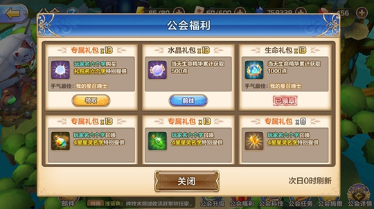 【公会系统】 除了传统的师徒、好友等社交系统之外,《星之召唤士》还充分考虑了公会互动的需求,推出众多趣味十足又不乏友爱互助的玩法。公会任务、公会副本、公会孕育都是游戏中的热门社交玩法。 公会星灵的孕育成长必须要由公会成员共同呵护,培养,最终根据孕育时做出的不同选择,成长为不同形态的星灵。想要培育出优质星灵,就必须要公会伙伴齐心协力、亲密互动,相信在星灵的培育过程中,原本或许陌生的两个人也将酝酿出伙伴的羁绊来。更有超多公会福利,加入即可领取~