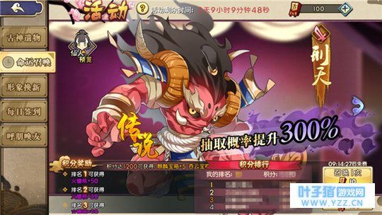 新仙人文殊 命运召唤 本期概率提升的仙人有刑天、观音、元始天尊、张奎、哮天犬和雷震子。除了刑天外,其他仙人的登场率并不算高,不过如果你是新服的话,倒是可以碰碰运气抽雷震子,毕竟前期有活动,把雷震子升星的话可以获得红桃子的奖励。如果你需求不是太强烈的话,元气娘建议你忍住别抽,等到新版本时再抽新仙人。