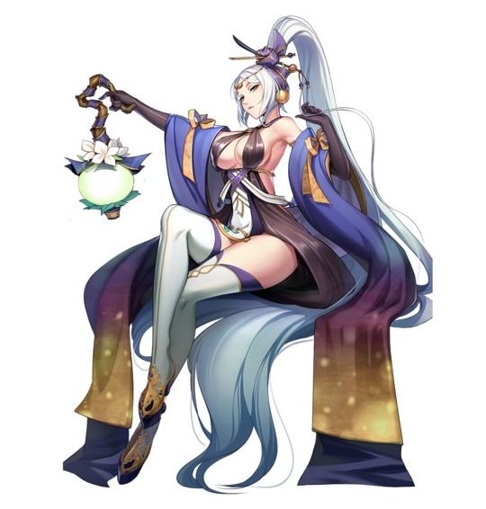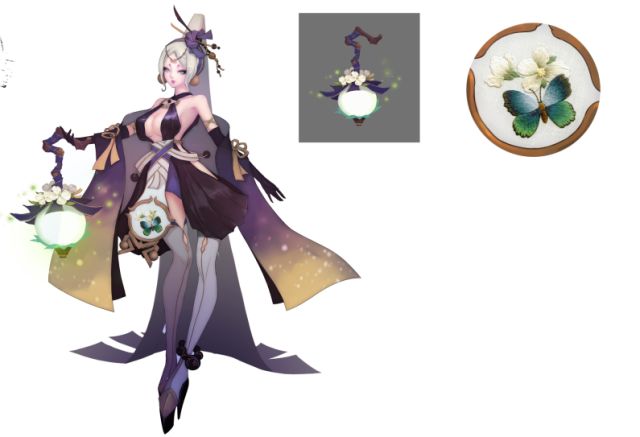 杨欣性格定位是一个 性感的御姐 ,还是一位 炼丹师 ,所以元素选取上就比较直接了,我们从花语上提取了 紫色,绿色,金色,木色 等色彩。剪裁上为了突出杨欣的 开放性感 ,所以裸露的相对多一些,显得 成熟妖娆 一些,为了符合 炼丹师 这么 国风的职业特色 , 武器和发饰 的设计上参考了一些 道家 的设计在里面。最后就设计出了大家所看到的这版杨欣。