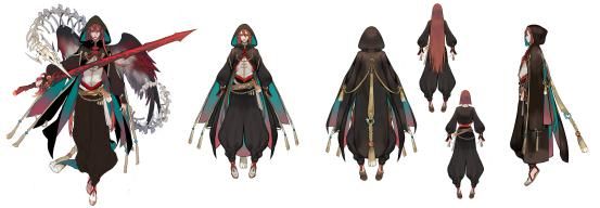 推翻这版方案之后,我们决定在段剑整体的设计上更多的去 体现他的经历 ,并且加入更多的 国风要素 ,于是我们舍弃了原来有些 暗黑贵公子 的衣着设定。色调上采用了 纯黑下暗藏的青绿色调搭配赭石色 的匹配,点缀上本身 龙血血脉的红色 要素。披风、上衣跟鞋子采用了 中国古典风格 的设计。 黑炎剑 也重新设计使其更符合原作描述。 龙 也直接简化成 远古骨架龙 。这个方案敲定之后就是大家之后看到的段剑立绘啦。
