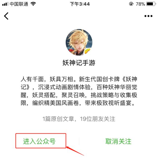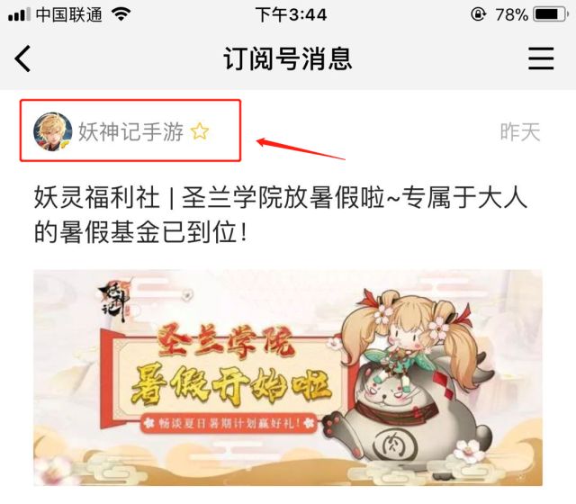 ①在 订阅号消息 中找到 “妖神记手游” 公众号消息,点击这个帅的一匹的头像。