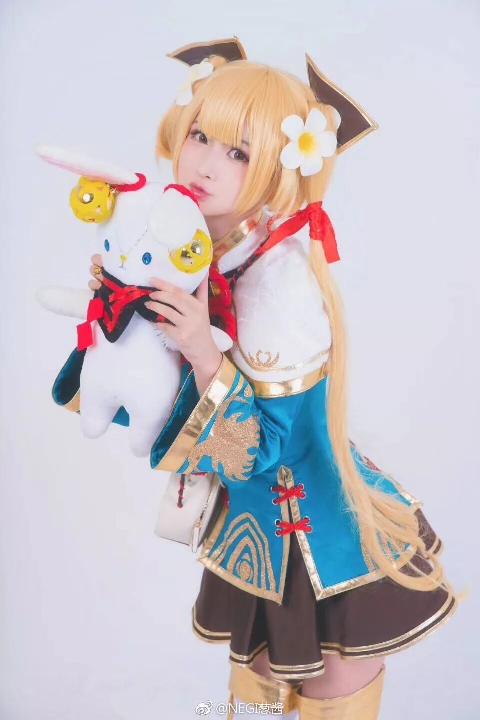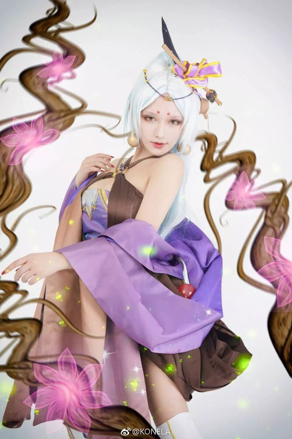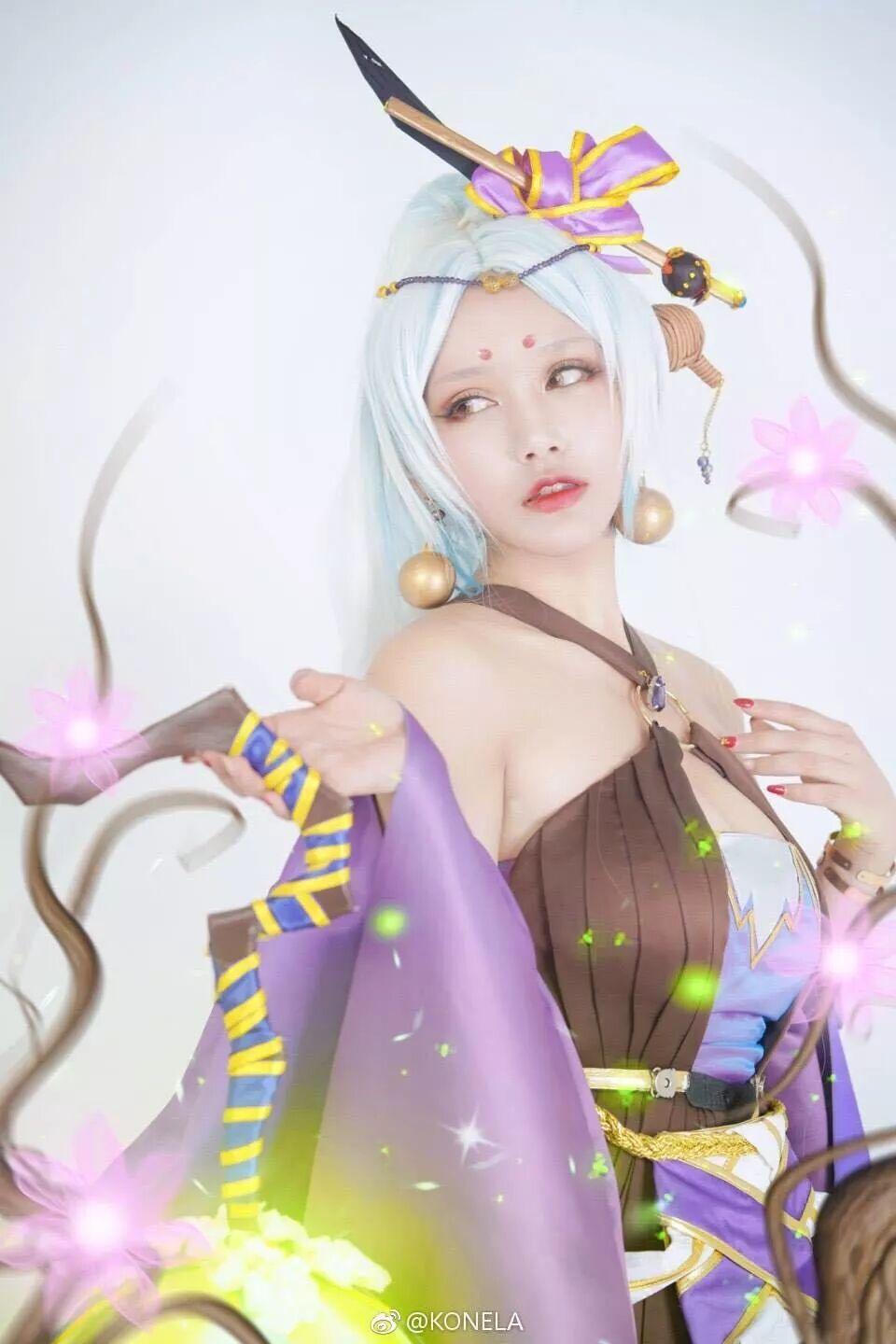 coser KONELA 选择用白色的背景来突出杨欣携带的植物妖灵特征与治疗的能力。