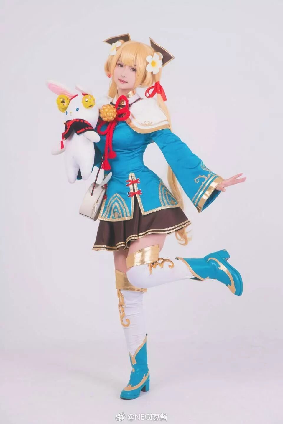 从图片中可以看到,coser扮演的聂雨穿的服装,以及手上的道具及圆形的小包都走的是萌系路线,这也很符合原作与游戏中聂雨的人设。一身蓝色的清新装扮,再加以服装里红色和金色恰到好处的点缀,显得整个形象都很生动活泼。