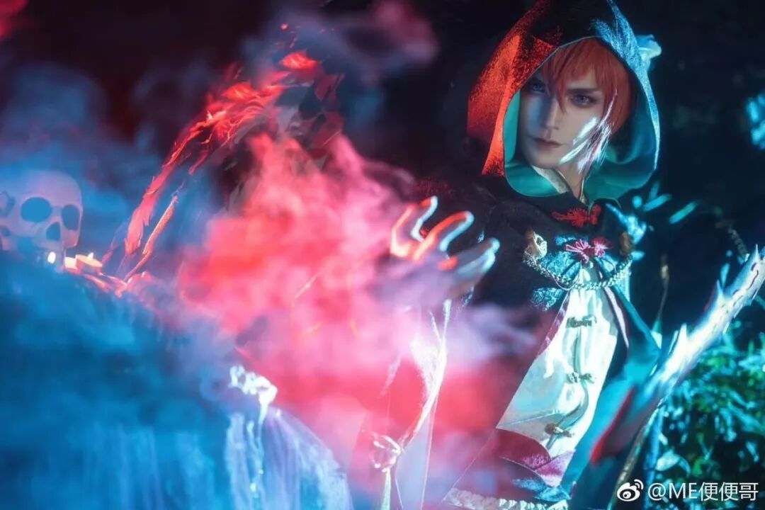 由 ME便便哥 创作的段剑cos,幽暗的色调一如段剑给人的印象,深度贴合角色的心理。浓重的眼妆、不苟言笑地神情、以及作为道具的骷髅头,烟雾缭绕间平添几分神秘莫测的诡异感。