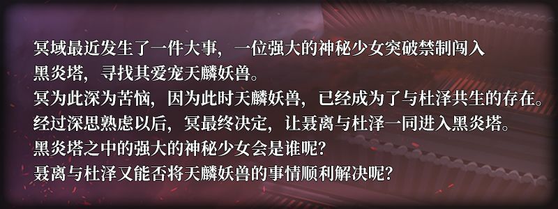 活动概要 活动内容 本次 “黑炎塔” 活动剧本,由《妖神记》原著作者 发飙的蜗牛 亲自监修,讲述了一位 强大的神秘少女 突破冥域的禁制闯入 黑炎塔 , 寻找其爱宠 天麟妖兽 而引发的故事, 这位强大的神秘少女究竟是谁? 聂离 又能否将事件顺利解决呢?让我们拭目以待!