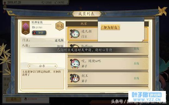 创建 & 加入宗门以后,我们就可以通过屏幕下方的宗门按钮,进入到宗门界面,在该界面的左下方,可以查看宗门的基本情况,包括宗门等级、目前人数、当前活跃度、宗门 ID 以及门主姓名,对宗门不满意的小伙伴,还可以在这里点击退出按钮,离开当前宗门,另谋出路(离开宗门需要 24 小时后方可再次加入)。右下方的宗门管理按钮,可以查看当前宗门的成员列表以及宗门公告等信息,在列表中选择其他同门,可以进行添加好友的操作。 二、宗门助益 创建或者加入一个宗门,对于小伙伴们闯荡江湖是很有帮助的。 首先,加入宗门,便意味着拥有了一批志同道合的同门好友,携手共同闯荡江湖,这样的好处是很明显的,诸如在外面受了欺负一类,大可以叫来宗门伙伴为自己助长声威!同时,宗门内成员,是好友的重要来源,通常情况下,对于陌生人的好友申请,我们可能并不会那么爽快的同意,而同门之人则更加方便的添加好友,如此,下副本的时候便有了稳定的助战好友哦!