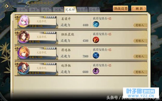 如果自身阵容中,中后排的实力更强,而前排则较为脆弱,那就应该选择一个能够承担前排功能的妖灵师进行助战。 当然,如果能够刷新到“大腿”级别的有缘人,那就完全不用考虑阵容问题,所谓一腿带四民,足够粗的大腿是完全有能力带领任何阵容顺利通关的 ,如果遇到这种,请不要犹豫,果断的选去吧!在助战界面,点击刷新按钮,即可刷新有缘人列表,多多尝试,大腿就在那灯火阑珊处! 三、抱大腿也可以有福利:友情聚灵与互送体力 在游戏中抱大腿,是自古以来无数玩家的第二大梦想(第一大梦想是自己成为大腿),有着优良的传统与精彩的历史,在《妖神记》手游中,更是为抱大腿添加了终极福利:友情聚灵与互送体力。 1 、友情聚灵 所谓的友情聚灵,指的是在剧情聚灵中,使用友情点进行聚灵,召唤妖灵师的功能。 友情点何处而来?自然是抱大腿抱出来的!