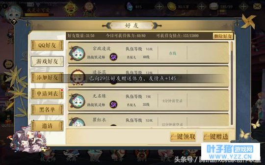在这里还要提醒小伙伴们一句: 游戏中好友的数量、每日可获得的体力和友情点,是有上限的,所以我们需要定期的清理好友类表,删掉那些经常不送体力或者多日不在线的“死尸好友”,选择更加活跃的好友,如此才能最大程度上的互惠互利。 以上就是今天为大家带来的内容,精彩不断,我们下期再见。 本文来源:今日头条,作者:腾讯游戏玩家创作联盟,转载请注明来源。 |