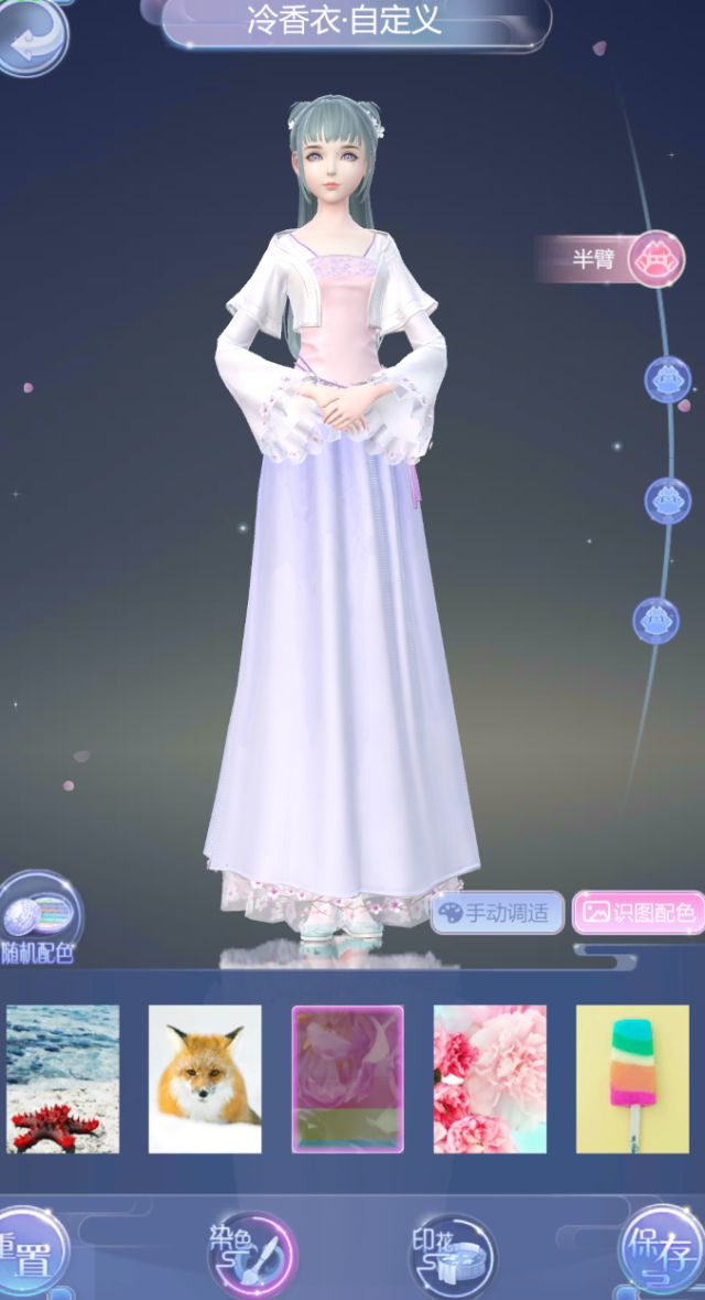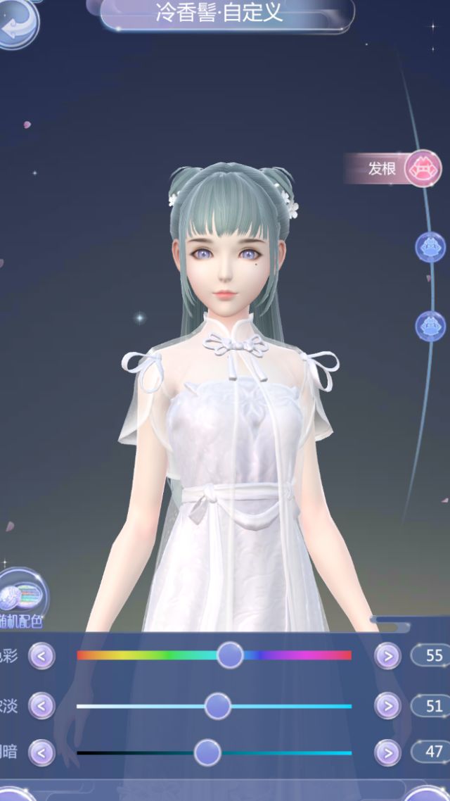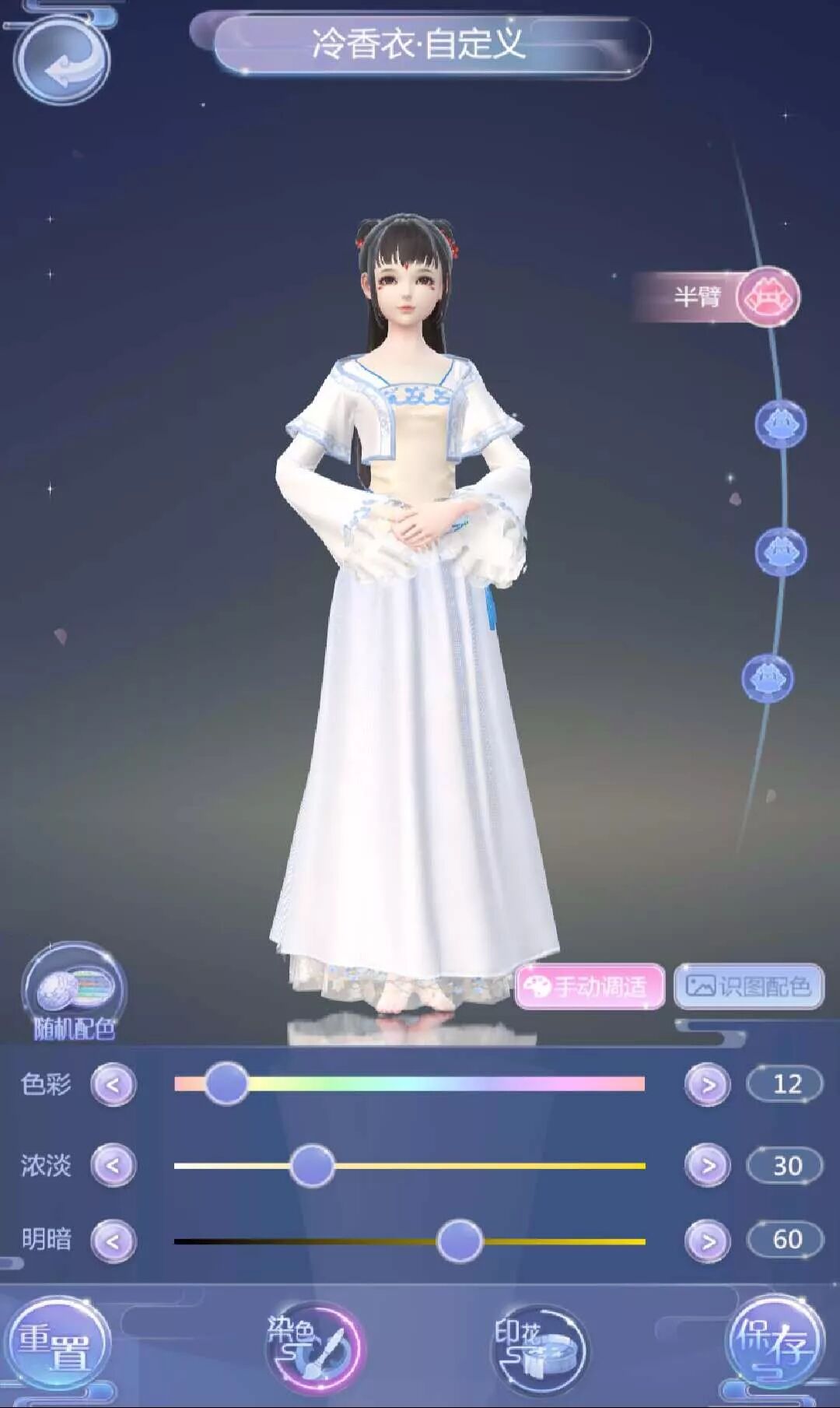 DIY发饰,我的造型,我做主 输入文字输入文字 大人可在已有的自定义发型中挑选想要改变的发型。半半来举个栗子,选择冷香髻·自定义,点击【进入编辑】按钮,即可自由创作了。可调节 发根 、 发梢 、 钿花 等的 色彩 、 浓淡 、 明暗 。 看看半半的创意,是否感受到了艺术的美~就这样,半半牌冷香髻诞生了,这个颜色多独特啊,回头率百分之两百不是梦。 DIY衣服,只为捕获心里的灵感 输入文字输入文字 大人挑选自己想要的改造衣服,点击 【进入编辑】 按钮。大人可以调整衣服的 半臂 、 裙 、 衫 、 纹 的 色彩 、 浓淡 、 明暗 。大人除了 手动调节 颜色外还可以使用一个神技能, 识图颜色 。 点击喜欢的图片,颜色即可一键获取哦~ 大人们要是觉得裙子太素了,不要紧,还有 印花 。选择喜爱的印花,调整印花 颜色 、 位置 、 大小 ,分分钟增强衣服的属性。印花的花花草草和小动物,总有一款适合大人的气场。 来看看半半的灵感之作,配合发型,半半还把衣服染成蓝色,加上淡雅的小花,好一个恬静优雅的女子啊~ 如果大人想偶尔偷个懒,没问题,我们还有高科技功能, 随机配色 ,一键自动变色哦,来看看效果,哇塞~简直是懒癌患者的福音,也是半半的最爱。咦~是不是暴露了什么~