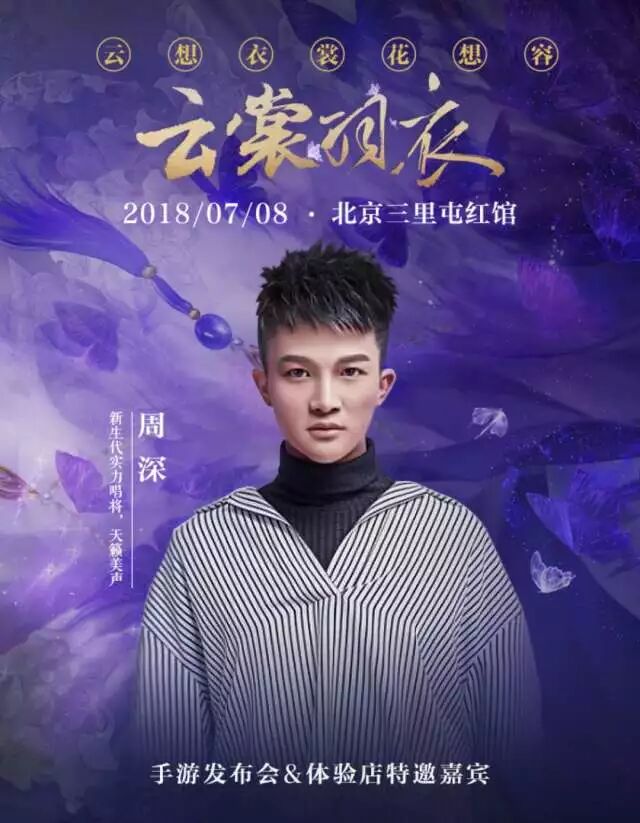 周深 中国内地著名歌手 ,以其独特的空灵嗓音而出名。 此次发布会上, 天籁美声周深 将倾情演绎由中国风经典作词人 方文山 老师操刀的 《云裳羽衣曲》 ,方文山老师的“诗情”加上周深的“画意”,赋予了《云裳羽衣曲》最为纯真的神韵。