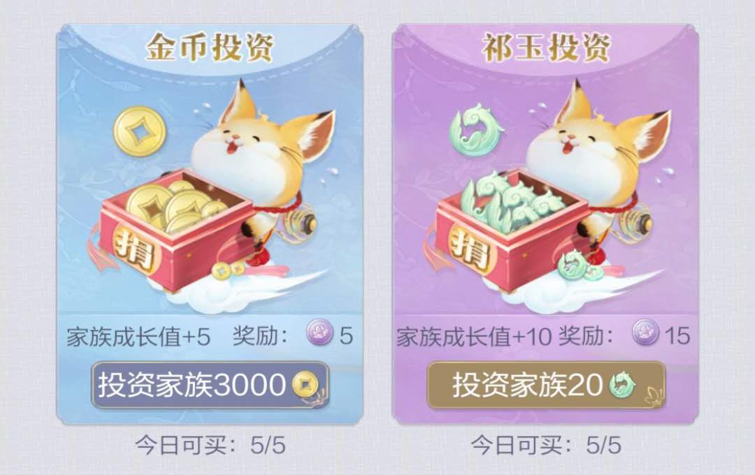 2.新增【贡献堂】 大人每日可捐献“金币”或“祈玉”为家族提高成长值,同时获得“ 家族币 ”奖励。