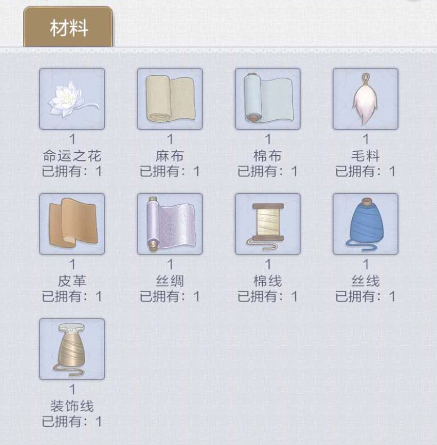 :命运之花、麻布、棉布、毛料、皮革、丝绸、棉线、丝线、装饰线