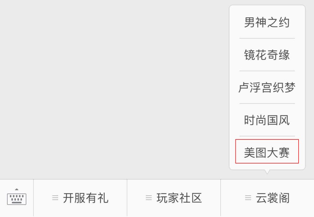 ①游戏内“美图大赛”活动开启后,大人在游戏内点击 【活动】-【限时】-【美图大赛】 ,即可进入活动界面参与活动; ②大人点击 公众号菜单栏【云裳阁】-【美图大赛】 ,即可参与活动;