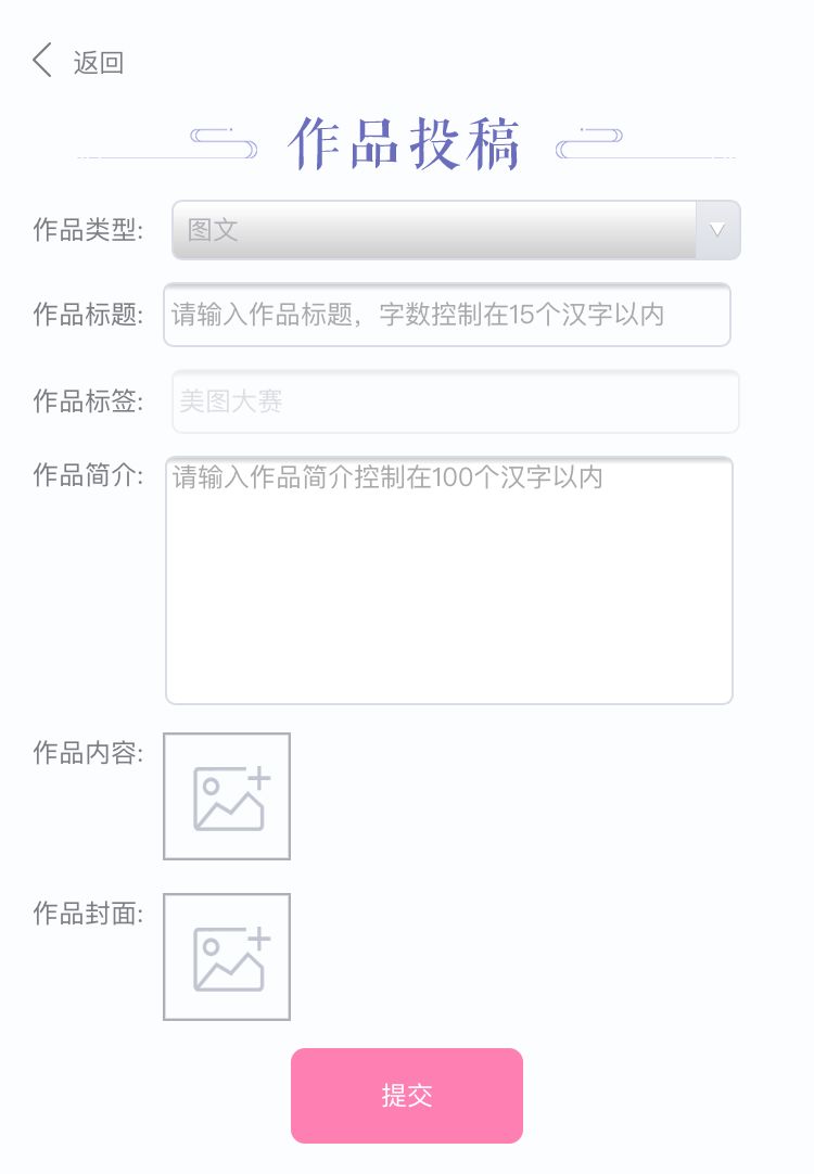 ③ 进入投稿页面后,填写作品标题、简介;上传游戏内的截图及封面;确认无误后点击“提交”,完成投稿;